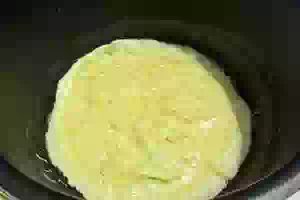 4. Дно чаши мультиварки смажьте сливочным маслом. Включите прибор в режиме «Запекание». Когда чаша разогреется, вылейте в неё омлетную массу. Силиконовой или деревянной лопаткой помешивайте смесь, пока она не схватится по всей поверхности.