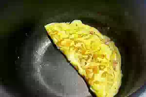 5. Когда жидкость загустеет, выложите на половину омлета начинку. Посыпьте солью и базиликом. Опустите крышку. Жарьте омлет 2-3 минуты. Приподняв край омлета, убедитесь, что его нижняя сторона хорошо прожарилась, а сам омлет не разваливается.