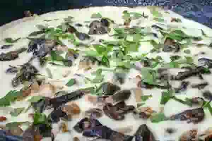 5. Влить яично-молочную смесь в грибы, немного перемешать, накрыть крышкой и готовить омлет в течение нескольких минут. Готовый омлет выложить на тарелку и украсить зеленью.