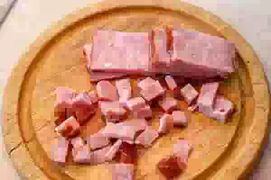 3. Ветчину нарезать маленькими кубиками и добавить к яйцам.
