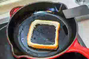 5. Разогреть сковороду, смазать растительным маслом и выложить рамку от ломтика хлеба.