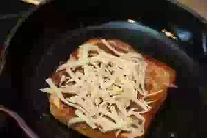 8. Посыпать поджаренную сторону тертым сыром, прикрыть крышкой, чтобы сыр быстрее расплавился. Яичница в хлебе с ветчиной и зеленым горошком готова.