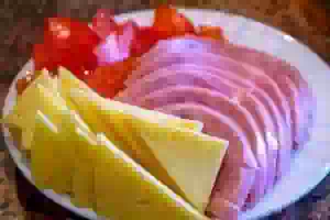 2. Ветчину, полпомидора, сыр нарезать ломтиками толщиной около 3 мм, батон - около 1 см.