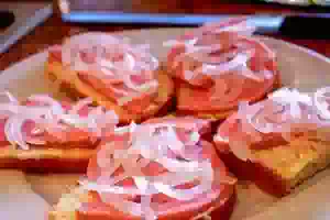 5. Все кусочки батона (и целые, и с вырезанной серединой), смазать с одной стороны майонезом. Сверху выложить ломтики ветчины, помидоров, немного лука и завершить ломтиками сыра.