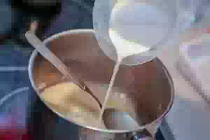 2. Постепенно, тонкой струйкой влить молоко, постоянно помешивая.