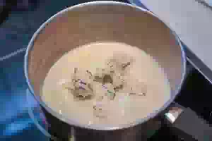 4. Как только смесь начнет закипать, добавить сыр стилтон, предварительно раскрошив его на кусочки. Варить соус, помешивая, пока сыр не расплавится. Приправить по вкусу, если хотите, но и без каких-либо добавок, этот сырный соус получается вкусным.