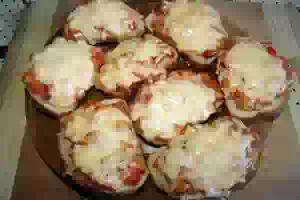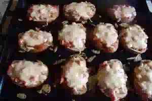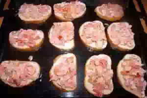 4. На противень выкладываем хлеб и на каждый кусочек выкладываем по 1-1,5 ложки начинки. Сверху посыпьте черным молотым перцем.