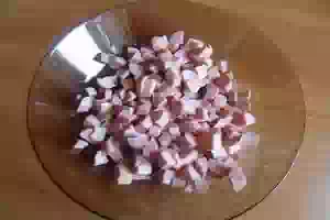 1. Сосиски нарезаем мелкими кубиками и выкладываем в глубокую миску.