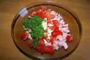 2. Помидор так же нарезаем кубиками, зелень мелко шинкуем и добавляем в тарелку к сосискам. Выдавливаем чеснок через чесночницу.