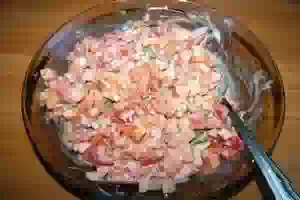 3. Майонез и кетчуп выкладываем к остальным ингредиентам и все тщательно перемешиваем.