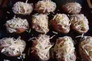 5. Сыр трем на крупной терке и посыпаем им каждый кусочек, но не следует добавлять слишком много сыра, так как он в процессе запекания будет растекаться по противню.