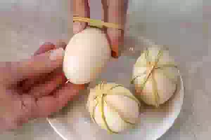 3. Вареные яйца переложить в холодную воду, дать им остыть. Так будет проще надевать на яйца резинки.