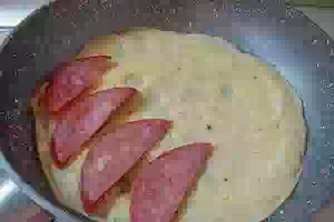 5. Как только верх начнет схватываться - на половинку яичного круга уложить колбасу