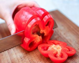 1. Большой сладкий перец, лучше красного цвета, вымыть, вытереть досуха салфеткой и порезать кольцами толщиной 5-7 мм. Удалить из колец перца семена и белые перемычки. Должно получиться не менее 4-5 больших колец. Их мы и будем использовать для приготовления яичницы-глазуньи.