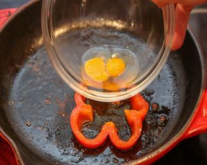 2. Разогреть на сковороде немного растительного масла и слегка поджарить кольца сладкого перца с двух сторон. Посолить и поперчить по вкусу. В небольшую мисочку наливать по 2 перепелиных яйца и осторожно переносить их в кольца перца на сковороде.