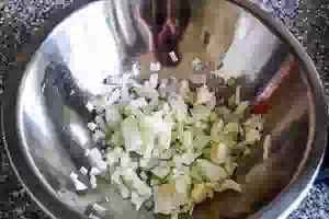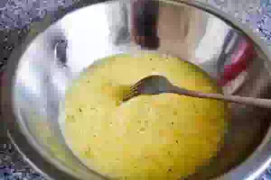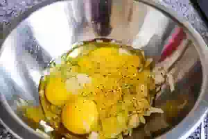 5. Вылить яично-луковую смесь, вернее её часть, тонким слоем, на разогретую с растительным маслом сковородку.