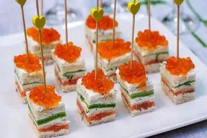 У меня это была разделочная доска и небольшая банка с водой. Оставить в таком виде на 30 минут. Затем каждый бутерброд смазать творожным сыром и порезать одинаковыми кубиками. Размер канапе определяйте по своему вкусу. Каждое канапе украсить красной икрой и воткнуть шпажку. Канапе на шпажках с красной рыбой, авокадо и красной икрой можно подавать к столу. Приятного аппетита!
