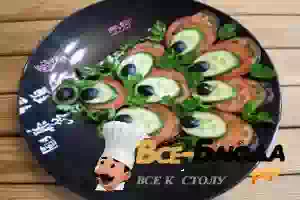 9. Берем большое блюдо и начинаем сборку закуски. Кладем в виде хвоста павлина кружочки баклажанов, сверху колечки помидоров, далее огурец.