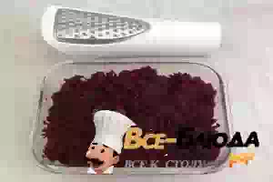 1. Свеклу тщательно вымыть и отварить, не обрезая верхушку и корешок. Варить надо примерно 1час 30 минут до мягкости. Свеклу охладить, почистить и натереть на средней терке.