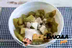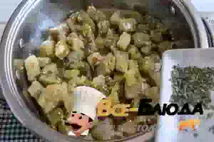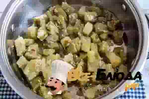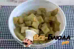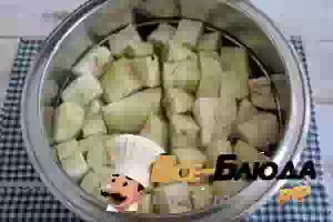 1. Баклажаны вымыть, порезать крупными кубиками и переложить в кастрюлю с кипящей соленой водой. Варить примерно 4-5 минут, пока баклажаны не станут мягкими и не поменяют свой оттенок.