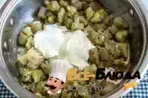 6. Вылить в сковороду с обжаренными баклажанами сметану.
