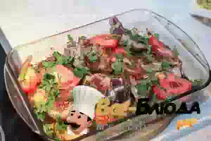 5. Переложить баранину поверх запеченного картофеля. На мясо выложить крупно нарезанные помидоры, посыпать свежей зеленью и поставить в прогретую до 190С духовку примерно на 15 минут. За это время мясо должно дойти до полной готовности и не успеть пересушиться. Готовую запеканку из баранины с овощами подавать к столу в той же форме, в которой она готовилась.
