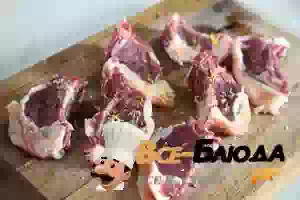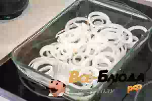 1. Баранью корейку разделить на котлеты с косточкой. Репчатый лук нарезать кольцами толщиной около 5 мм и выложить на дно смазанной маслом жаропрочной формы.