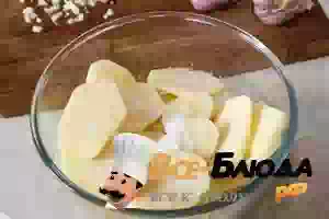 2. Картофель очистить, нарезать толстыми кружочками, сложить в миску, смешать с измельченным чесноком и посолить. Выложить картофель в жаропрочную форму поверх слоя лука. Полить растительным маслом (или разложить кубики сливочного масла). Поставить в форму в духовку на 30 минут.