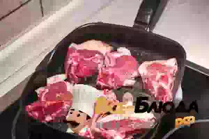 4. Разогреть сковороду, влить немного масла и положить неочищенные зубчики чеснока, предварительно раздавив их ножом. Прогреть чеснок на масле, а затем положить баранину - обжарить с двух сторон по несколько минут, только чтобы образовалась корочка, которая не позволит при запекании мяса вытечь мясному соку.