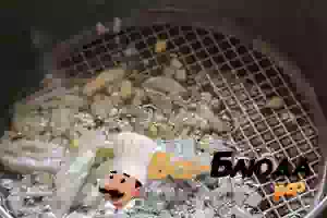 2. На разогретом растительном масле пассеровать мелко нарезанный репчатый лук. Добавить порезанный пластинами чеснок и прогреть, помешивая, еще пару минут.
