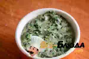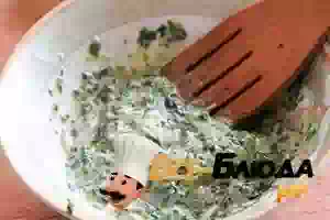 5. Шпинат к этому времени должен полностью растаять на сковороде, а вся лишняя жидкость из него испариться. После этого переложить зелень со сковороды на тарелку, даем остыть в течение 5 минут и смешать шпинат с основой из яйца и сыра.
