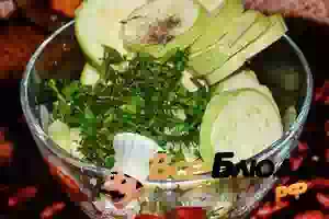 2. Чеснок натереть мелко. Отправить чеснок в миску с кабачками. Всыпать туда соль, перец и измельченную зелень. Тщательно перемешать все.