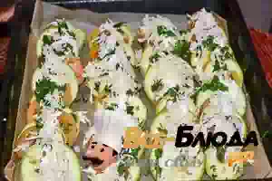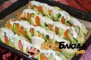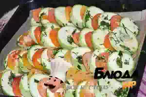 3. Противень застелить пергаментом. Кружки кабачков выложить на противень длинными полосками. Помидор порезать кружками. На каждый круг кабачка положить помидор. Следует соблюдать последовательность чередования кусочков.