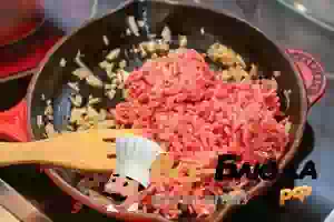 1. Приготовить мясную начинку. В сковороде разогреть растительное масло и пассеровать до мягкости мелко нарезанный лук и рубленый чеснок. Добавить мясной фарш и продолжать обжаривать все вместе, помешивая и разбивая лопаткой образующиеся мясные комочки.