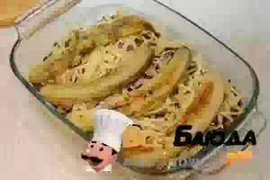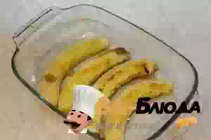 4. Форму для запекания смазать маслом. Выложить на дно формы в один слой половину бананов.