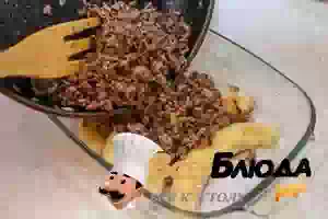 9. Залить мясную запеканку с бананами яичной смесью и посыпать оставшимся сыром. Запекать пуэрториканскую лазанью с мясом и бананами в духовке, разогретой до 200С примерно 20 минут. Готовую запеканку из бананов с фаршем достать из духовки, дать остыть в форме и можно подавать к столу.