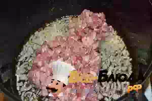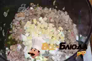 2. Порезать кубиками 3 яйца и добавить к мясу. Тщательно перемешать, посолить и поперчить по вкусу.