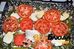 5. Небольшую форму для выпечки смазать растительным маслом, отправить фасоль с мясом и яйцом и выровнять. Украсить оставшимся вареным яйцом и ломтиками помидоров.