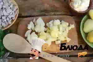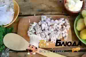3. Кубиком такого же размера порежьте картофель, который предварительно очистите.