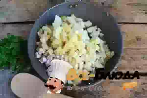 4. Обжарьте картофель вместе с грудкой на сковороде до легкой румяной корочки. Это придаст запеканке дополнительной хрусткости.