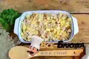 6. Выложите обжаренный картофель и индейку в жаропрочную форму для запекания.