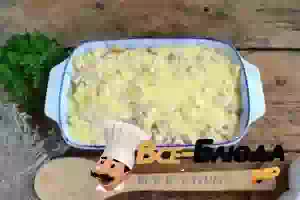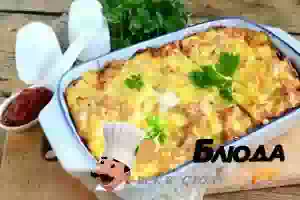 7. Залейте все яично-майонезной смесью и отправьте в духовку на 20 – 30 минут (температура — 180 градусов). Как только яйцо запечется и образуется красивая румяная корочка, запеканка готова. Выньте ее из духовки и дайте немного остыть.