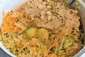 2. Все овощи моем, очищаем и измельчаем на крупной тёрке. Это очень быстрый и совсем нетрудоёмкий процесс. Хлеб подсушиваем в духовке и перемалываем в крошку. Смешиваем тщательно овощи, яйцо и хлебную крошку. Солим, добавляем специи.