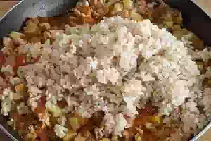 3. Мясо нарезаем маленькими кубиками и обжариваем с репчатым луком до появления на мясе корочки. Затем добавляем к курятине порезанный кубиками перец, молодой кабачок и овощную пасту. Посыпаем всё пряностями и солим. Тушим до готовности мяса. Перемешиваем рис с овощами и фаршем. Форму смазываем сливочным маслом. Выкладываем смесь в форму.