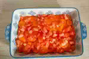 2. Помидор и перец нарезаем мелким кубиком и укладываем все овощи слоями.