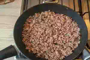 3. Мясной фарш обжариваем на сковороде около 20 минут, разбивая лопаткой образующиеся комочки. Солим и перчим по своему вкусу. Готовый фарш выкладываем на овощи.