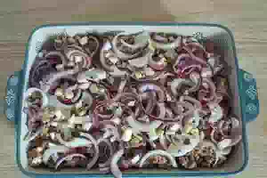 4. Репчатый лук очищаем от шелухи и нарезаем полукольцами. Выкладываем на фарш.