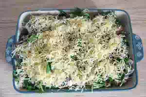 6. Сыр трем на мелкой терке и выкладываем сверху.