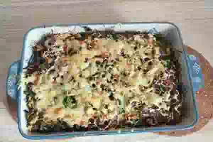 11. На тарелку кладем запеканку из овощей с мясным фаршем и сыром, рядом - горку булгура. Ужин (или обед) готов.