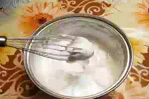 3. Белки начинаем взбивать на минимальной скорости, постепенно повышая обороты блендера. Доводим консистенцию белков до плотной пены. После этого небольшими порциями вводим сахар. Взбиваем белки, пока сахар полностью не раствориться, до получения гладкой воздушной структуры.